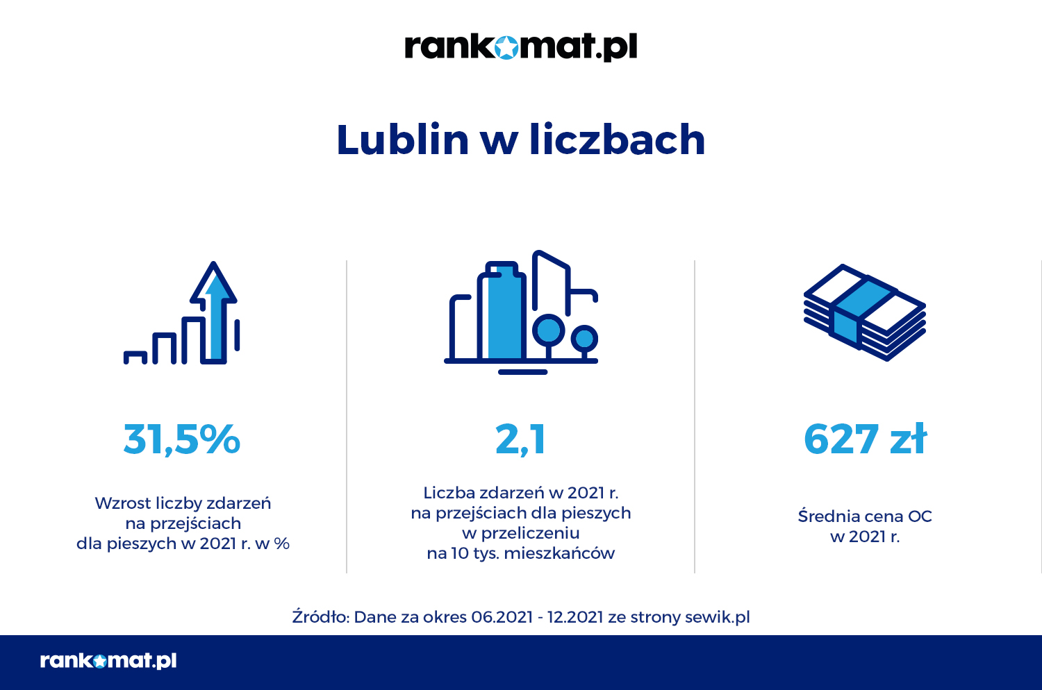 Eksperci rankomat.pl przeanalizowali pochodzące ze strony sewik.pl dane dotyczące liczby kolizji i wypadków na przejściach dla pieszych (z udziałem pieszych). Z ich ustaleń wynika, że od czerwca do grudnia 2021 roku aż w 10 województwach liczba takich zdarzeń zwiększyła się o kilka do nawet kilkudziesięciu procent w porównaniu do tego samego okresu w roku poprzednim. Podobny problem dotyczy największych polskich miast – należy do nich też Lublin. Miasto to znalazło się w gronie ośrodków, w których statystyki uległy pogorszeniu. Dla porównania najwyższy, bo 7-krotny wzrost liczby zdarzeń na pasach z udziałem pieszych zanotowano w Kędzierzynie-Koźlu. Z drugiej strony największy progres odnotowały Gniezno i Rybnik, gdzie liczba ta zmniejszyła się o ponad 50%.