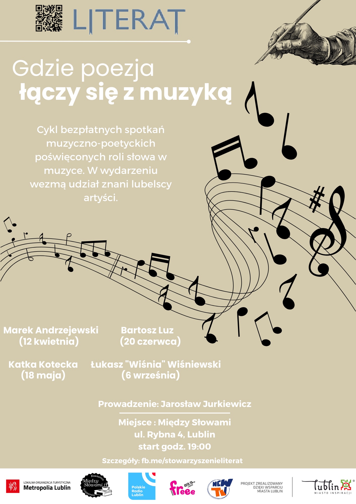 „Gdzie poezja łączy się z muzyką” to seria czterech spotkań poświęconych znaczeniu słowa w muzyce i wpływowi na twórczość artystyczną. Raz w miesiącu w kawiarnio-księgarni Między Słowami odbywać się będą spotkania z osobami z różnych kręgów artystycznych, piszącymi teksty do utworów muzycznych. Spotkania będą miały charakter wywiadu, który zwieńczy mini-koncert zaproszonego artysty/ki. Podczas wydarzenia tekściarze/rki i poeci/tki opowiedzą, jak wygląda ich proces twórczy, jak rozumieją rolę słowa w muzyce, znajdą różnice między wierszem a słowami do piosenki, a także wskażą młodym artystom sposoby na znalezienie lirycznej weny. Spotkania poprowadzi Jarek Jurkiewicz – muzyk, kompozytor, aranżer, filozof, członek duetu Jarząbek-Jurkiewicz.
