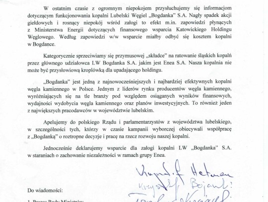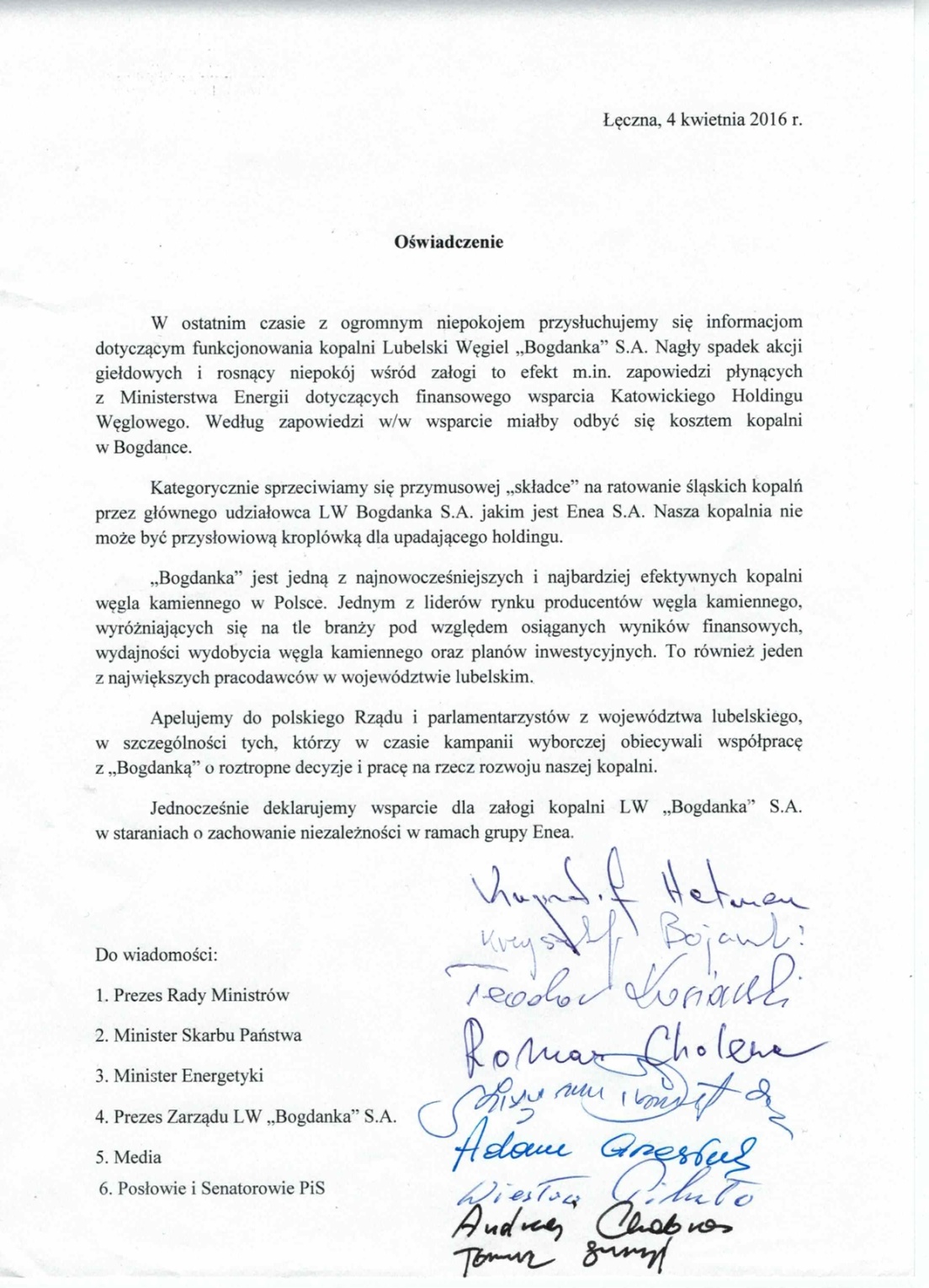 Oświadczenie dot. LW " Bogdanka" podpisane.