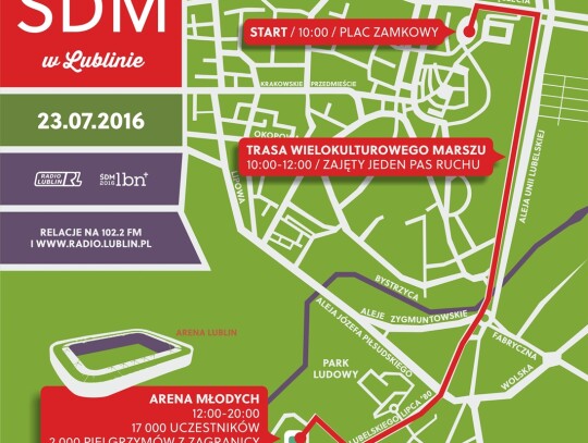 Ale zanim o 12:30 rozpoczną się oficjalne uroczystości na stadionie, wcześniej, bo o godz. 10:00 spotykamy się na placu Zamkowym. Stąd grupy z zagranicznymi uczestnikami przejdą w barwnym korowodzie na stadion. Dla mieszkańców i kierowców oznacza to utrudnienia w mieście na czas przemarszu, ale też później. Samo pokonanie trasy zajmie ok. 2 godz. Przejdziemy z placu Zamkowego, Al. Tysiąclecia, al. Unii Lubelskiej, ul. Lubelskiego Lipca 80. W czasie przemarszu zajęty będzie jeden pas ruchu. Ul. Lubelskiego Lipca '80 będzie zamknięta w sobotę, a parking przed stadionem zarezerwowany jest tylko dla autokarów. Te do Lublina docierać będą od godz. 10:00, dla 150 takich autokarów przeznaczone są miejsca na parkingach Lubelskich Targów i przed Zarządem Dróg i Mostów w Lublinie.