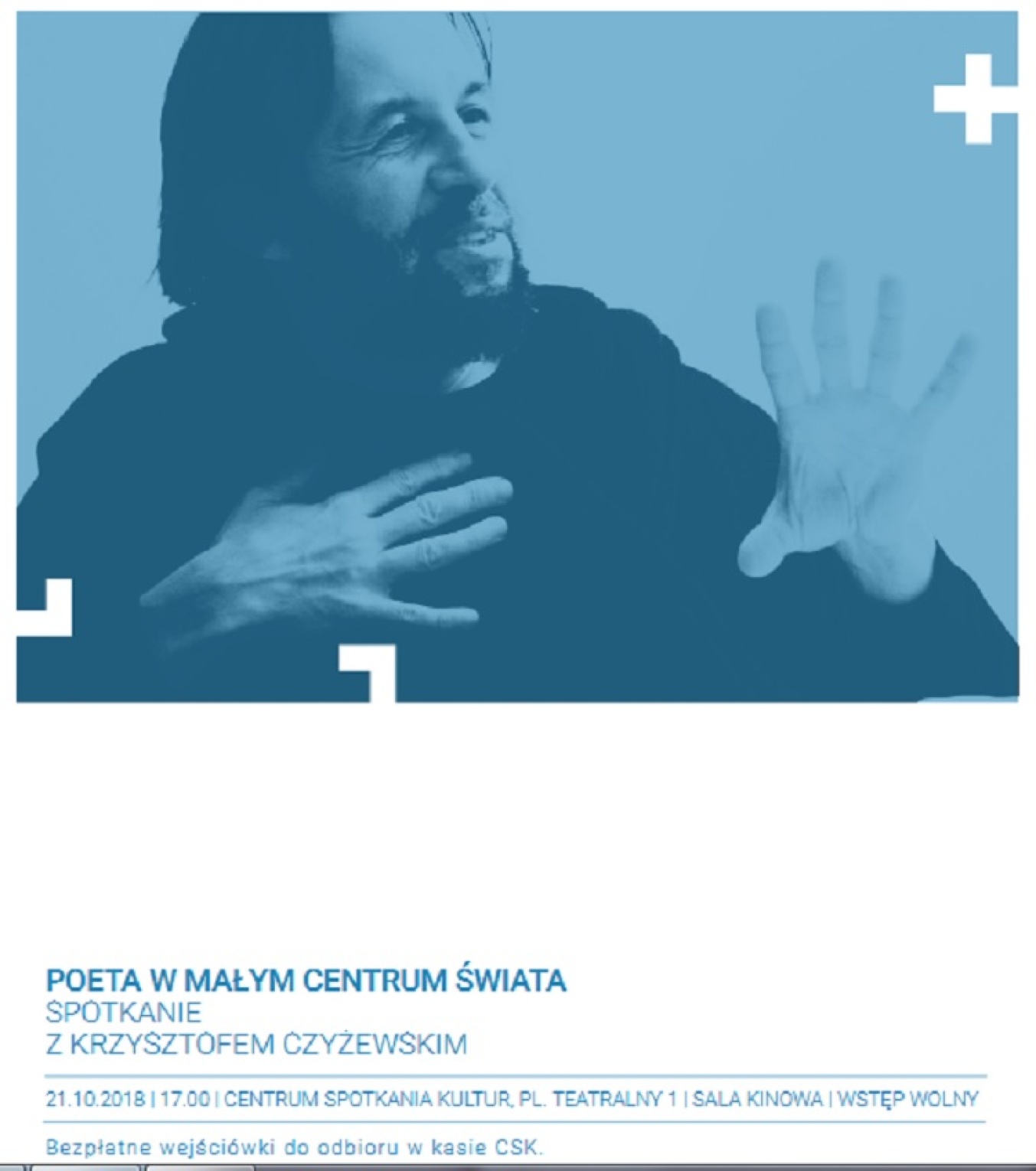 Podczas spotkania z Krzysztofem Czyżewskim porozmawiamy o jego dwóch ostatnich książkach: „Żegaryszki” (poezja/fotografia) oraz „Małe centrum świata. Zapiski praktyka idei” (esej). Krzysztof Czyżewski (ur. 1958 w Warszawie) jest animatorem kultury, poetą, eseistą, współtwórcą Ośrodka „Pogranicze – sztuk, kultur, narodów” w Sejnach oraz Fundacji Pogranicze. W 1994 r. powołał do istnienia pismo „Krasnogruda” i został jego redaktorem naczelnym. Redaktor naczelny „Almanachu Sejneńskiego”. W Wydawnictwie „Pogranicze” jest redaktorem serii wydawniczych „Meridian” i „Sąsiedzi”. Jako eseista współpracował z paryską „Kulturą” do końca jej istnienia. Jego eseje ukazują się w prasie polskiej (m.in. „Tygodnik Powszechny", „Konteksty", „Znak") i zagranicznej. Jest laureatem licznych nagród i wyróżnień. Rozmowę z Czyżewskim poprowadzą Aleksandra Zińczuk, redaktor naczelna magazynu Kultura Enter oraz dr Łukasz Marcińczak – eseista i filozof.