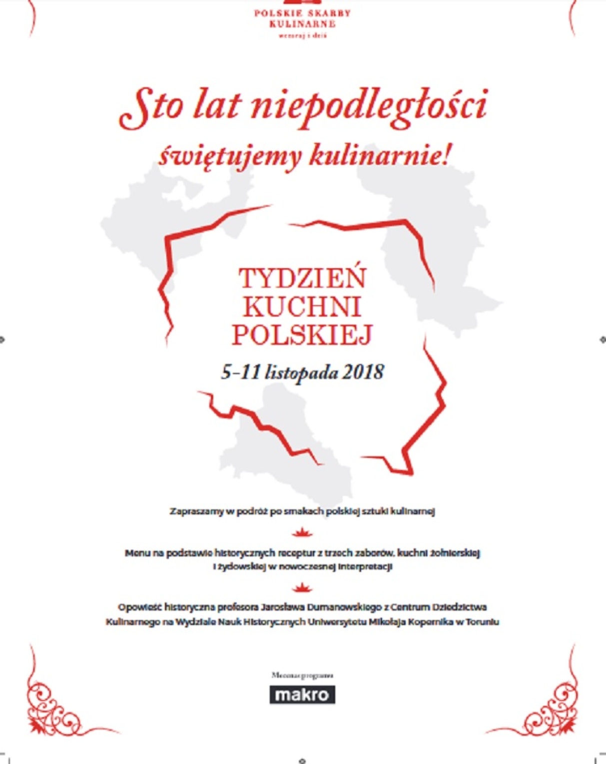 Warszawa, 30 października 2018: Z okazji setnej rocznicy odzyskania przez Polskę niepodległości, wybrane restauracje z Lublina wprowadzą na tydzień od 5 do 11 listopada specjalne menu inspirowane różnymi regionami i kuchniami XIX i XX-wiecznej Polski. Historycznym potrawom w nowoczesnej interpretacji towarzyszyć będzie opowieść historyczna profesora Jarosława Dumanowskiego z Centrum Dziedzictwa Kulinarnego na Uniwersytecie Mikołaja Kopernika w Toruniu. Akcja Tydzień Kuchni Polskiej organizowana jest przez sieć hurtowni MAKRO Polska w ramach edycji specjalnej programu Polskie Skarby Kulinarne – Kulinarne Zjednoczenie Polski.