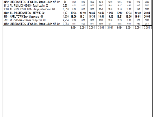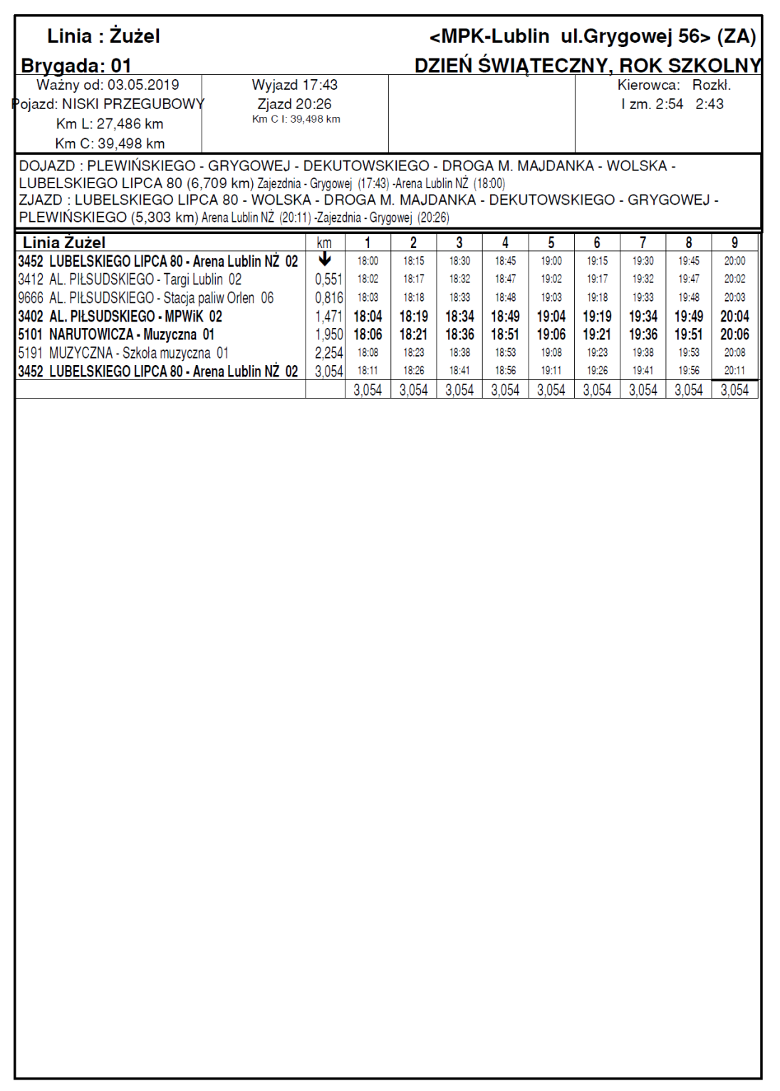 Linia ŻUŻEL będzie odjeżdżać z przystanku Arena Lublin NŻ 02 w godz. 18:00-20:00 co 15 minut i pojedzie trasą: Lubelskiego Lipca 80 – Piłsudskiego – Narutowicza – Muzyczna – Lubelskiego Lipca 80. Dla kibiców dojeżdżających na mecz zostanie ustawiony tymczasowy przystanek na al. Piłsudskiego przy stacji paliw. Linia będzie realizowana przez niskopodłogowy autobus przegubowy. Dodatkowo, po zakończeniu meczu, na tymczasowy przystanek na al. Piłsudskiego naprzeciwko stacji paliw, zostanie podstawiony autobus przegubowy, który odwiezie kibiców na parking przy Arenie Lublin. W załączeniu trasa przejazdu linii ŻUŻEL oraz rozkład jazdy.a