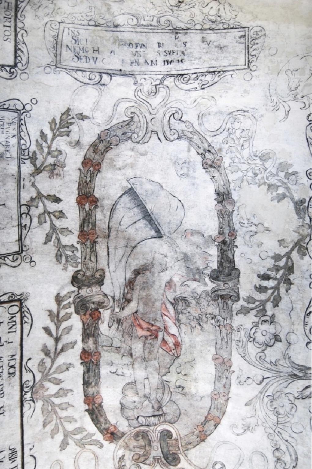 „Odnaleziono wzory graficzne dla wszystkich przedstawień umieszczonych na ścianach pomieszczenia. Większość z nich (7) pochodzi z książki emblematycznej, która jest jednocześnie rodzajem sztambucha Emblemata Saecularia autorstwa Johanna Theodora i Johanna Israela de Bry, wydanej w 1596 r. we Frankfurcie nad Menem.