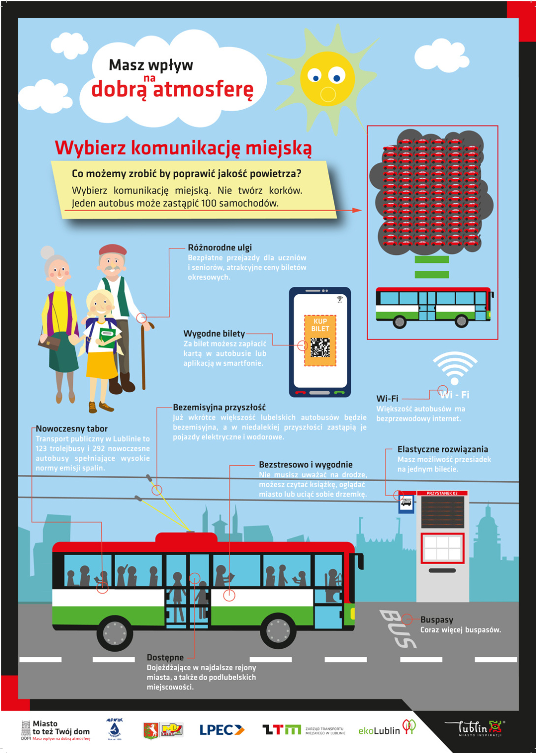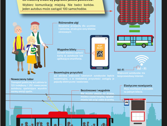 Lublin poprzez inwestycje w ekologiczny transport miejski wychodzi naprzeciw problemom, z którymi borykają się współczesne miasta m.in. zanieczyszczeniem powietrza. 70% autobusów w Lublinie to pojazdy posiadające normę zużycia paliwa Euro 5 i Euro 6. Komunikacja miejska już dzisiaj spełnia najwyższy przewidziany w ustawie o elektromobilności 25% próg udziału autobusów zeroemisyjnych. W 2021 r. po realizacji projektów unijnych, w taborze lubelskiej komunikacji miejskiej będzie 70 autobusów elektrycznych i 150 trolejbusów – miasto osiągnie 50% udziału pojazdów elektrycznych w całym taborze pojazdów komunikacji miejskiej. To ważne, bo autobus, który emituje niewiele większą ilość spalin niż samochód osobowy, przewozi tyle osób ile 100 samochodów osobowych.
