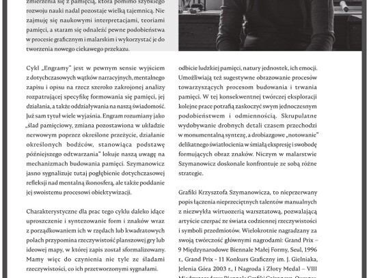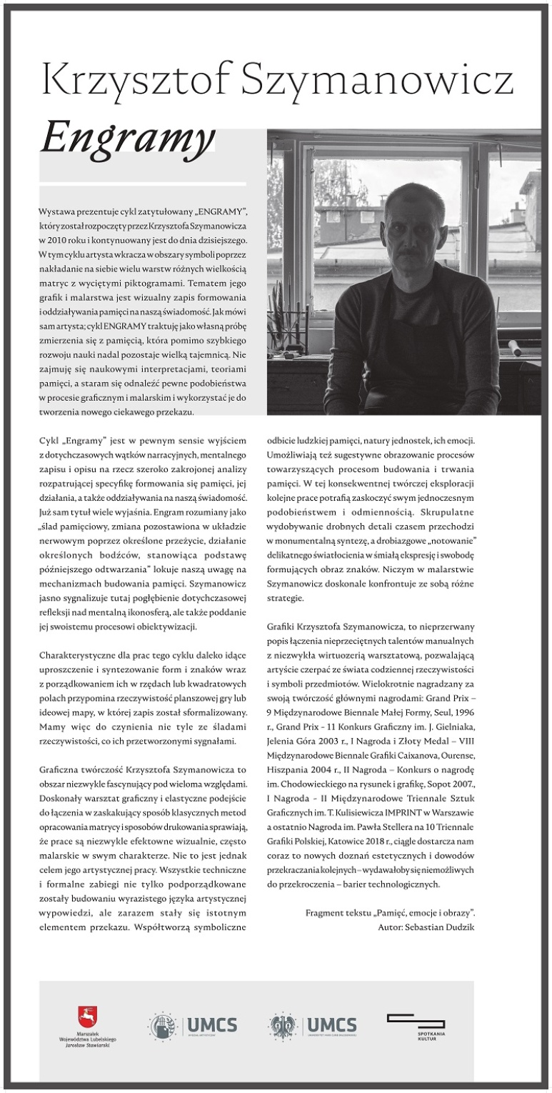 Ekspozycja prezentuje cykl ,,ENGRAMY”, który został rozpoczęty przez grafika w 2010 roku i kontynuowany jest do dnia dzisiejszego. Artysta wkracza w obszary symboli poprzez nakładanie na siebie wielu warstw różnych wielkością matryc z wyciętymi piktogramami. Tematem jego grafik i malarstwa jest wizualny zapis formowania i oddziaływania pamięci na naszą świadomość.