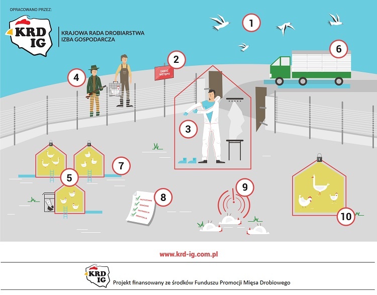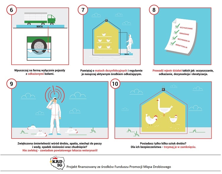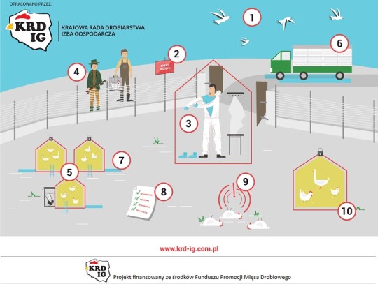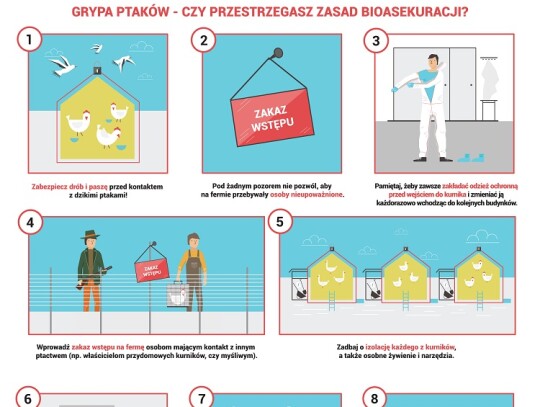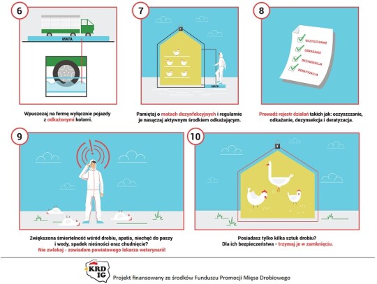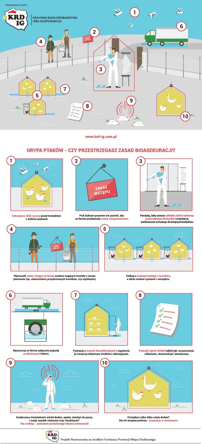 KRD-IG zwraca się z apelem do wszystkich hodowców i producentów drobiu o szczególne zachowanie ostrożności oraz bezwzględne przestrzeganie zasad bioasekuracji, aby obecnie zarejestrowany przypadek nie doprowadził do rozprzestrzeniania się wirusa. Utrzymanie drobiu w zamknięciu zmniejsza ryzyko zakażenia wirusem, jednak nie eliminuje zagrożenia całkowicie. Dlatego też podkreślamy, że do najważniejszych czynności należy: zabezpieczenie budynków, w których utrzymywany jest drób przed dostępem dzikich zwierząt, w tym dzikiego ptactwa;zabezpieczenie paszy i źródła wody przed dostępem dzikiego ptactwa; niekarmienie i niepojenie drobiu na zewnątrz budynków inwentarskich; stosowanie w gospodarstwie odzieży i obuwia ochronnego przeznaczonego wyłącznie do obsługi drobiu; stosowanie mat dezynfekcyjnych przy wejściach do budynków, w których utrzymywany jest drób. KRD-IG zaleca również małym hodowcom drobiu trzymanie ptaków w zamkniętych budynkach i niewypuszczanie ich na zewnątrz, aby zminimalizować ryzyko kontaktu z wirusem. Ogniska grypy ptaków tego samego typu, tj.H5N8 wystąpiły już w Polsce na przełomie 2016/2017. KRD-IG przypomina, że podtyp H5N8 wirusa grypy ptaków nie stanowi zagrożenia dla ludzi.Zalecane jest jednak ścisłe przestrzeganie zasad higieny w przypadku kontaktu z ptakami, szczególnie dzikimi. Podkreślamy także, że spożywanie poddanego obróbce termicznej mięsa drobiowego jest całkowicie bezpieczne dla zdrowia człowieka.Przypominamy, że zgodnie z obowiązującym prawem hodowcy powinni zgłaszać do odpowiednich osób i instytucji każde podejrzenie wystąpienia choroby zakaźnej u drobiu.