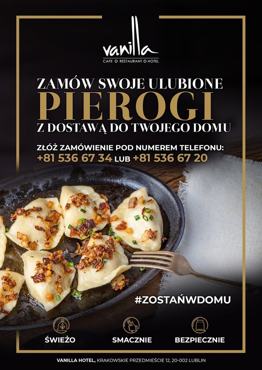 Układając sobie życie w innych warunkach z pewnością będą wracać wspomnienia do ulubionych miejsc i smaków dlatego Grupa Vanilla postanowiła ruszyć z dostawami. Hitem okazują się być pierogi oferowane przez Vanilla Cafe i ciasta z dowozem do domu oferowane przez naszą cukiernię Vanilla. Przygotowywane w sterylnych warunkach potrawy są starannie pakowane, a następnie trafiają do mieszkańców Lublina i okolic. Należący do Grupy In Between Hotel postawił na smaczne, zdrowe i domowe posiłki, a dla firm stworzył „Mobilną Kantynę” dostarczając codziennie do firm zestawy obiadowe. Warto podkreślić, że dania przygotowywane są codziennie rano, tak by świeże docierały w południe do firm, a popołudniu do domów Lublinian.