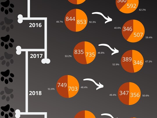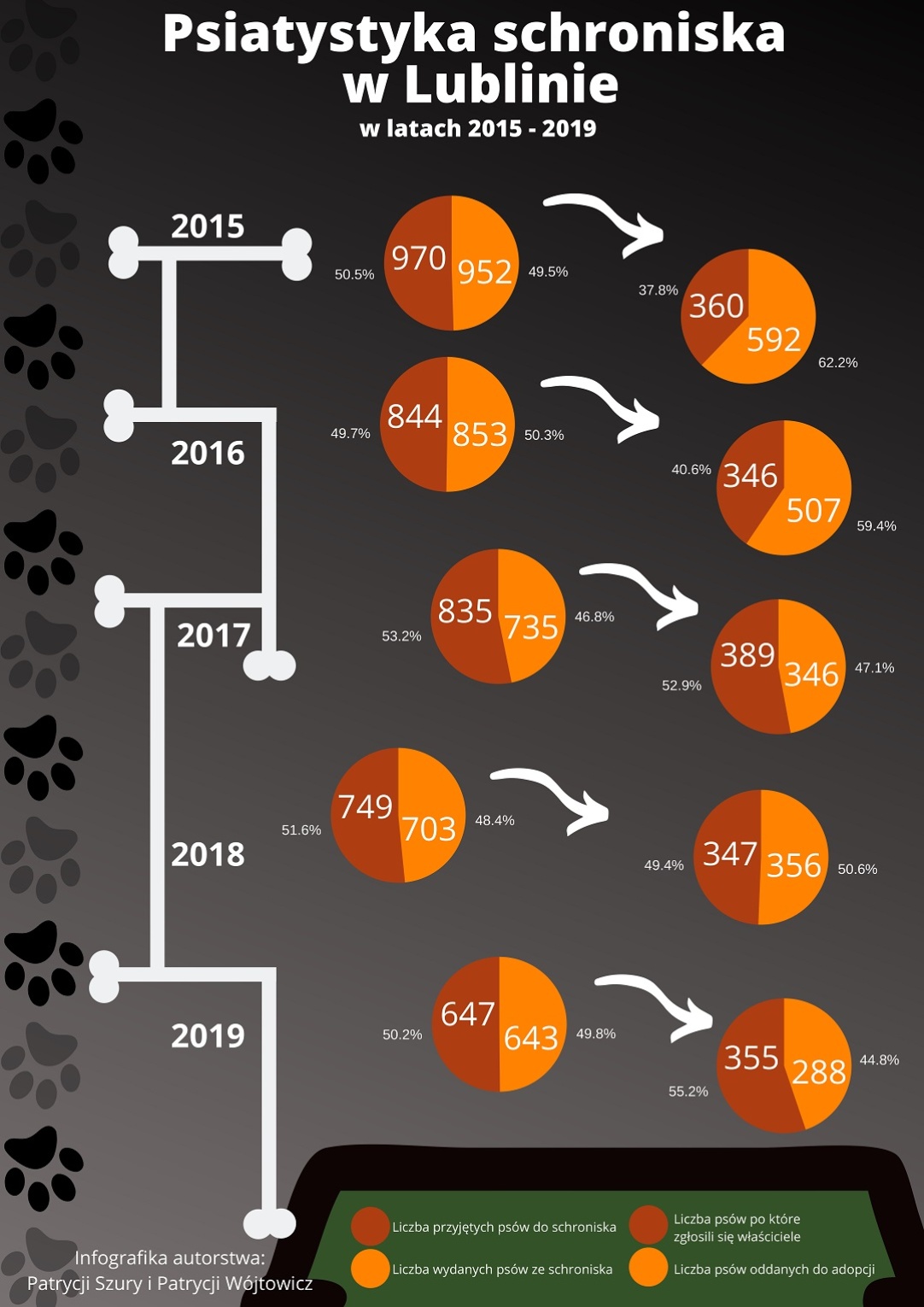 Sytuacja związana z podopiecznymi schroniska jest dynamiczna. Najlepiej świadczą o tym statystyki. Dla porównania: w 2015 r. do schroniska trafiło 970 psów, z czego 952 wydano – w tym 592 zostało adoptowanych, a po 360 zgłosili się właściciele. Rok później liczba przyjęć zmniejszyła się o blisko 130 w porównaniu z rokiem ubiegłym (844 przyjęcia). W tym też roku liczba wydanych czworonogów (853) przewyższyła liczbę przyjęć. Tym razem 507 psiaków znalazło swój nowy dom, a 346 wróciło do swoich właścicieli. W 2017 r. w swoich domach z powrotem znalazło się 389 szczekających czworonogów, a 346 dostało nową szansę (z przyjętych wtedy 835 wydano 735). Przed dwoma laty natomiast do schroniska trafiło 749 psów – do domów powróciło wtedy 347 z nich, a adoptowano 356 (łącznie 703 wydania). W 2019 r. do schroniska przyjęto natomiast o ponad sto mniej zwierząt (647) niż w roku poprzednim, z czego niemal wszystkie (643) niedługo opuściły placówkę: aż 355 odebrali właściciele, a 288 znalazło nowy dom.